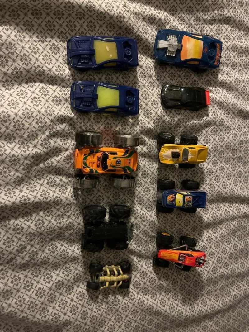 1 är orange på 1sida och röd på andra. 1saknar 1gummihjul… vänligen syna bilderna för skicket.