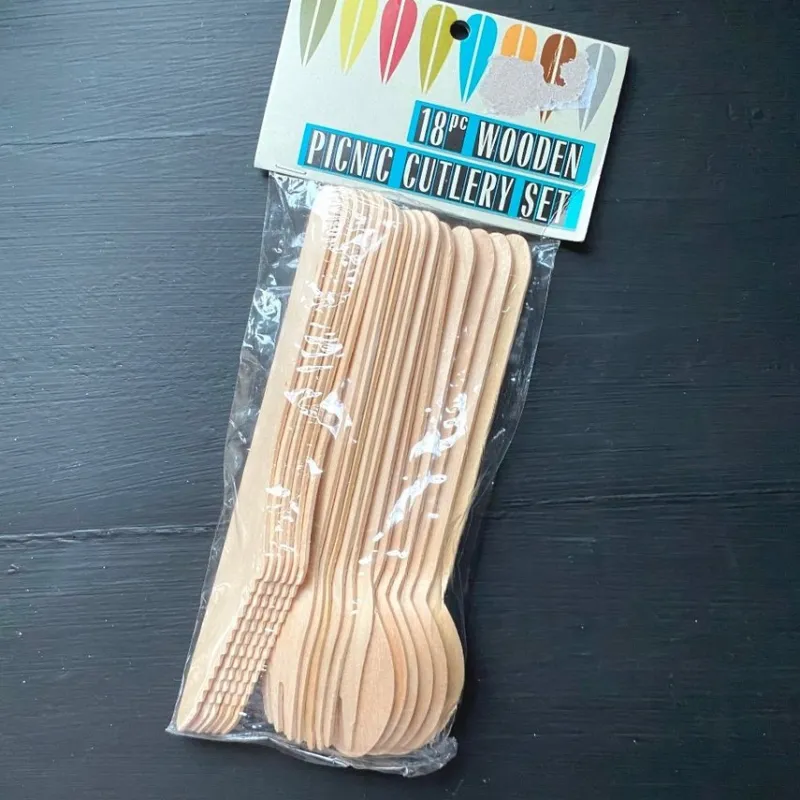 18-pack träbestick perfekt för picknick eller andra tillfällen. Setet innehåller 6 knivar, 6 gafflar och 6 skedar. Tillverkat av hållbart björkträ.