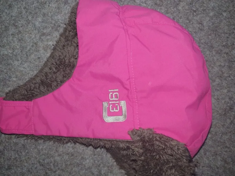 En rosa mössa med en grå pälskant. Mössan har en logotyp på framsidan.