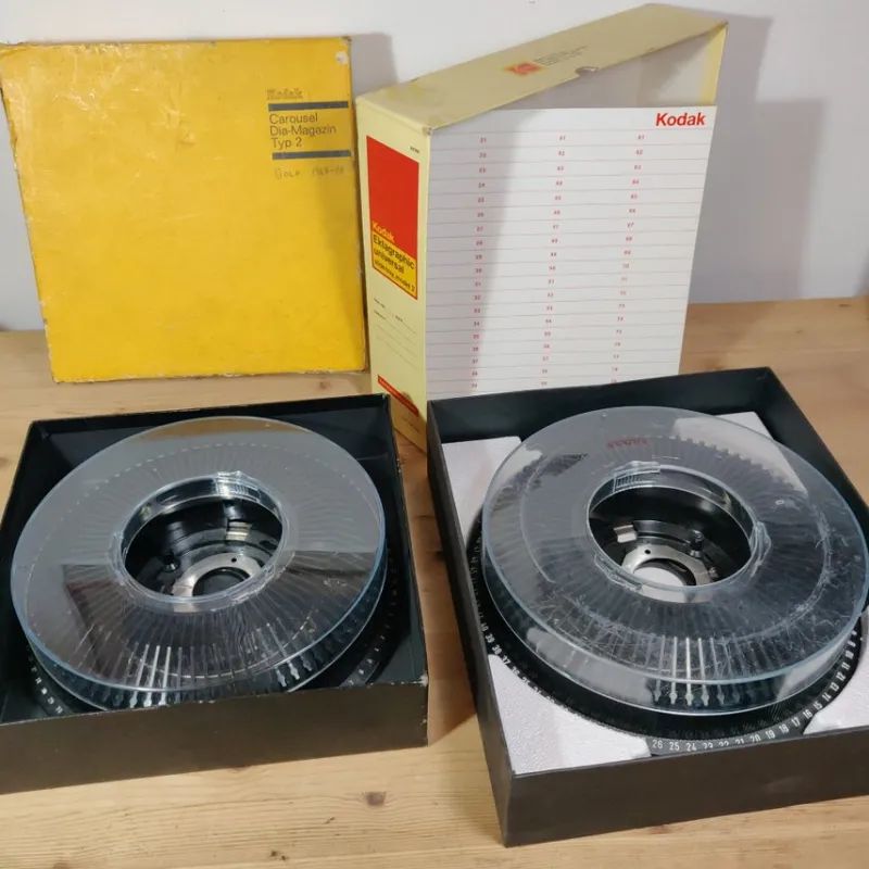 En styck begagnat och en styck ny diamagasin till Kodak Carousel, av olika ålder. Den gula lådan i sämre skick, har tejpats samman.