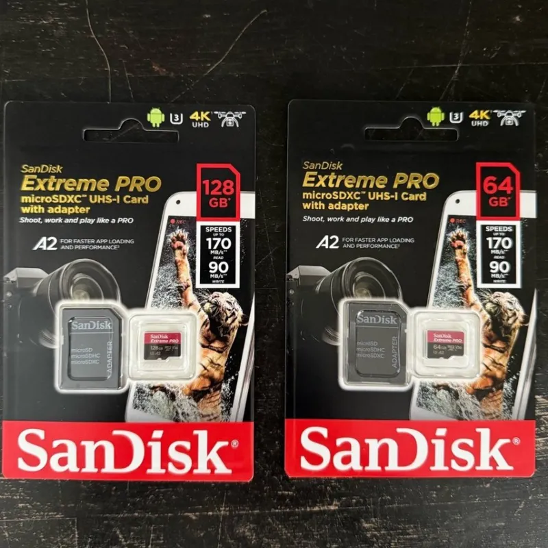 Säljer två SanDisk Extreme PRO microSDXC-kort med adapter. Korten är UHS-I klassade och har A2-prestanda för snabbare applikationer. Det ena kortet har en lagringskapacitet på 64GB, det andra på 128GB. Båda korten erbjuder läshastigheter på upp till 170 MB/s och skrivhastigheter på upp till 90 MB/s.