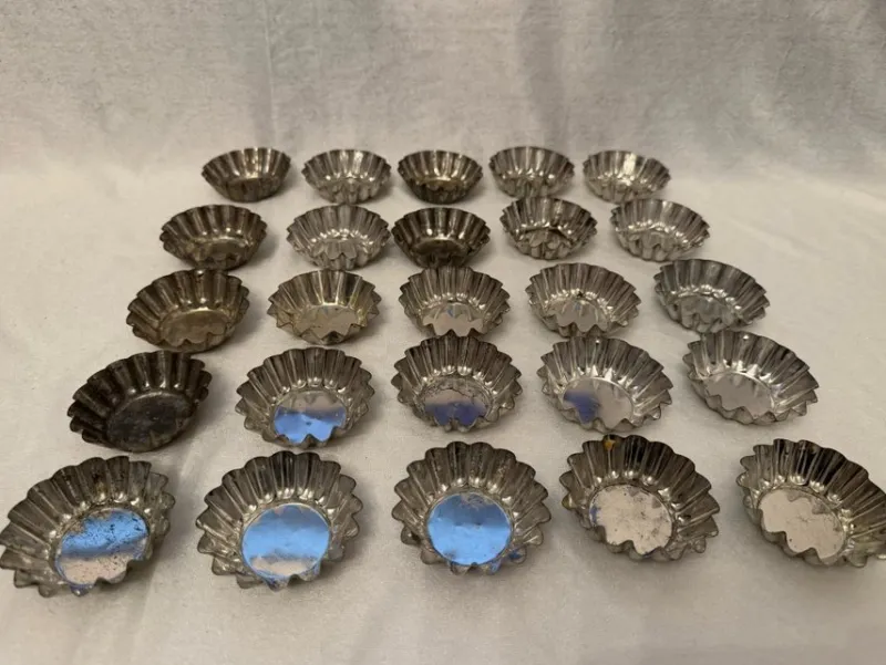 25 stycken små metallformar, perfekta för att baka små tårtor, desserter eller andra bakverk. Bra skick