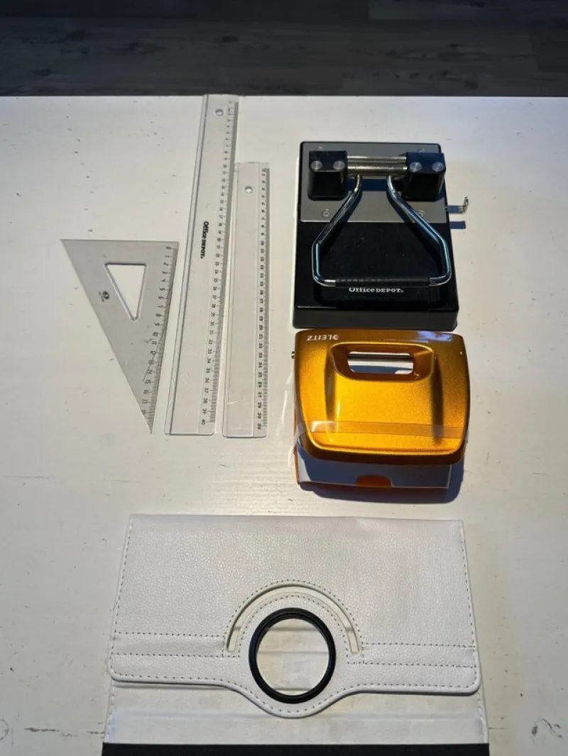 Linjaler använt skick, något fodral, en ny och en begagnad hålslagare.