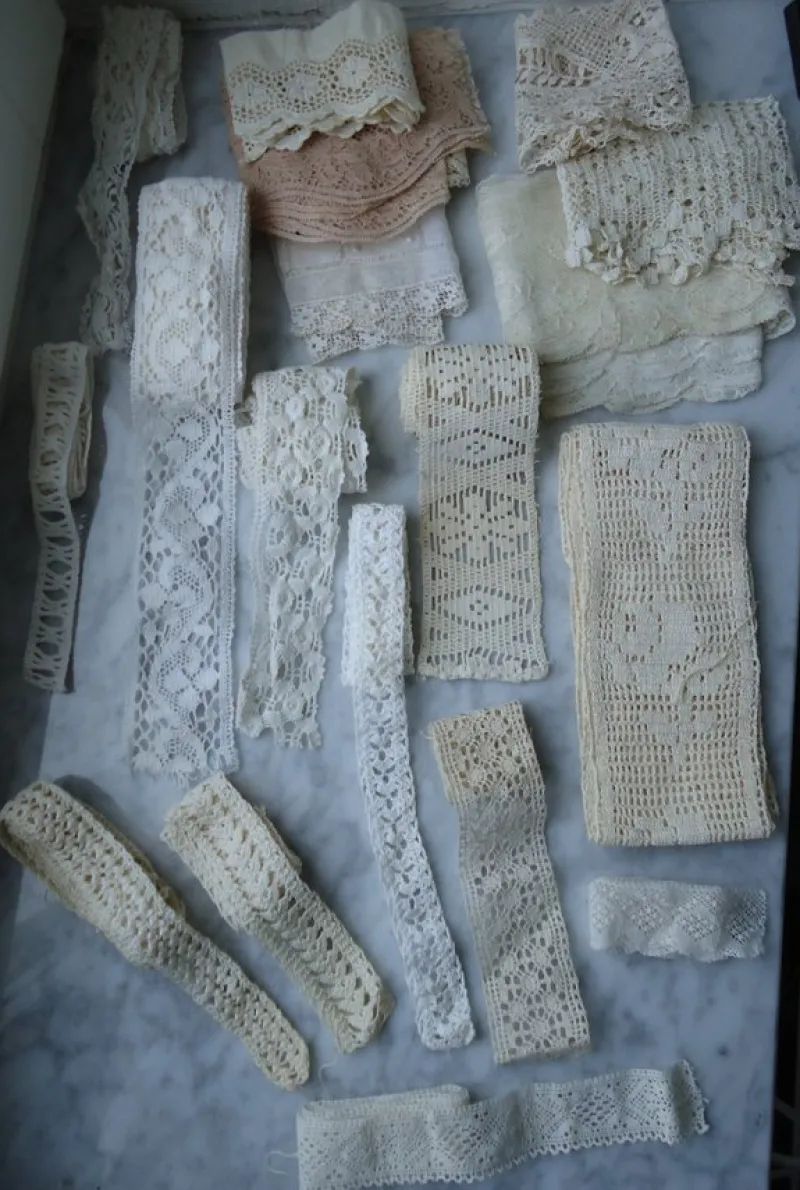 Fint fång av blandade och olika typer av äldre spetsar, bårder, spetsband.