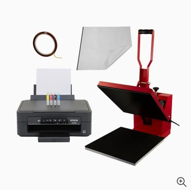 Paketet innehåller allt du behöver för att trycka dina egna motiv på t-shirts. Paketet innehåller en Epson skrivare, en värmepress, transferpapper, tejp och bläckpatroner.