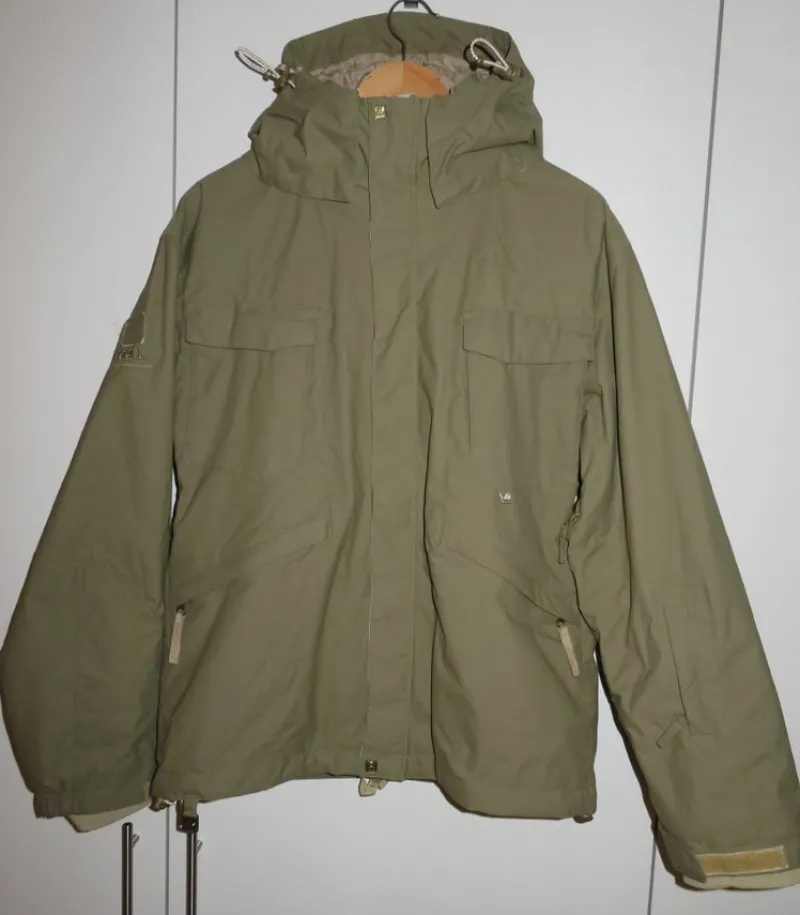 En robust skaljacka för snowboardåkning och alpin skidåkning. Herrstorlek M med bröst/midje/stussmått upp till 102 cm, ärmlängd armhåla till ärmslut 53 cm och längd axelparti till ryggslut 70 cm. Vind/vattentätt yttertyg av nylon och med tejpade sömmar. Invändigt fodrad med meshtyg och slätt tyg av nylon och polyester samt förstärkt med fleecetyg i kragen och ärmsluten. Envägs YKK frontdragkedja med inre och yttre vindslå med kardborrestängning på den yttre vindslån. Avtagbar huva med trepunkts dragskojustering, vädringsdragkedjor under ärmarna och elastiskt snölås på jackans nedre insida. Två handfickor med blixtlås, två bröstfickor med dubbel kardborrestängning, en extra bröstficka med blixtlås på höger sida samt en liten liftkortsficka med blixtlås på vänster ärm. På jackans insida finns två mindre fickor. Kardborrejustering i ärmsluten och dragskojustering i jackans nederkant. Vikt 1040 gram.