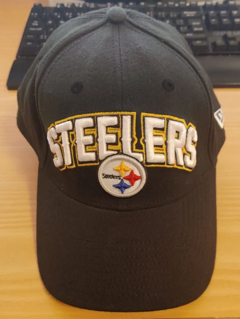 Svart keps med Pittsburgh Steelers logotyp på framsidan och baksidan. Kepsen är i New Era-stil med en justerbar storlek.