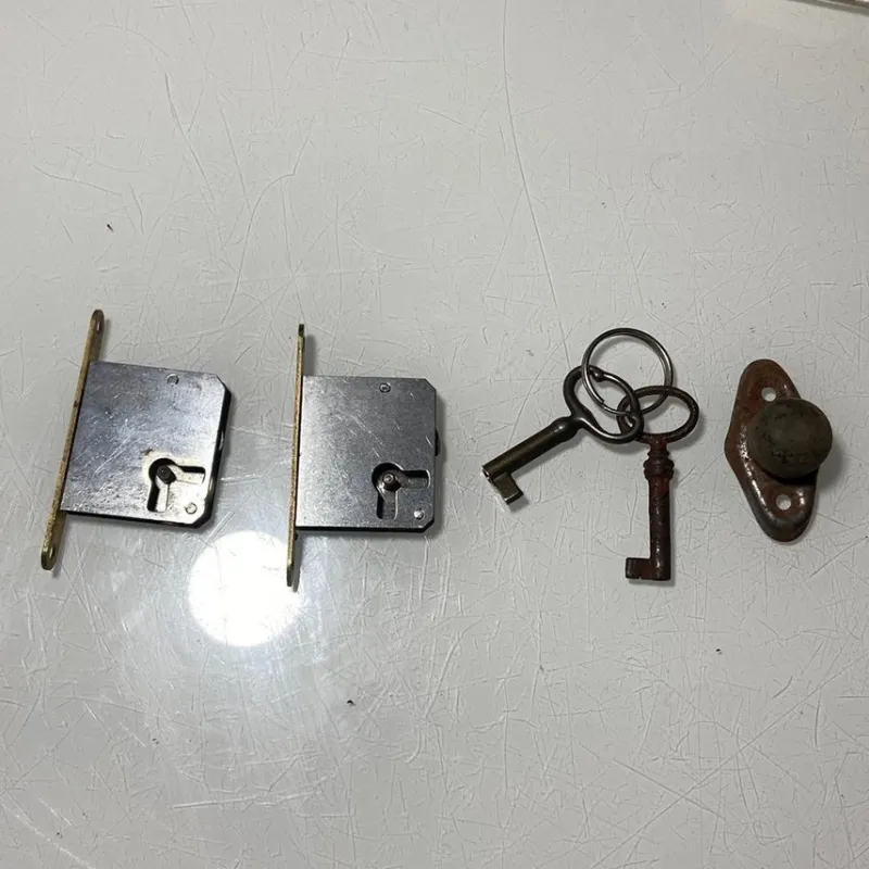 Två antika låsbeslag i metall med tillhörande nycklar. Beslagen är av enkel design och passar för olika typer av möbler eller föremål. En liten knapp/knopp i metall ingår även. Måtten på beslagen är ca 5 cm x 4 cm. Perfekt för dig som är intresserad av antikviteter eller vill ge dina möbler en unik touch.