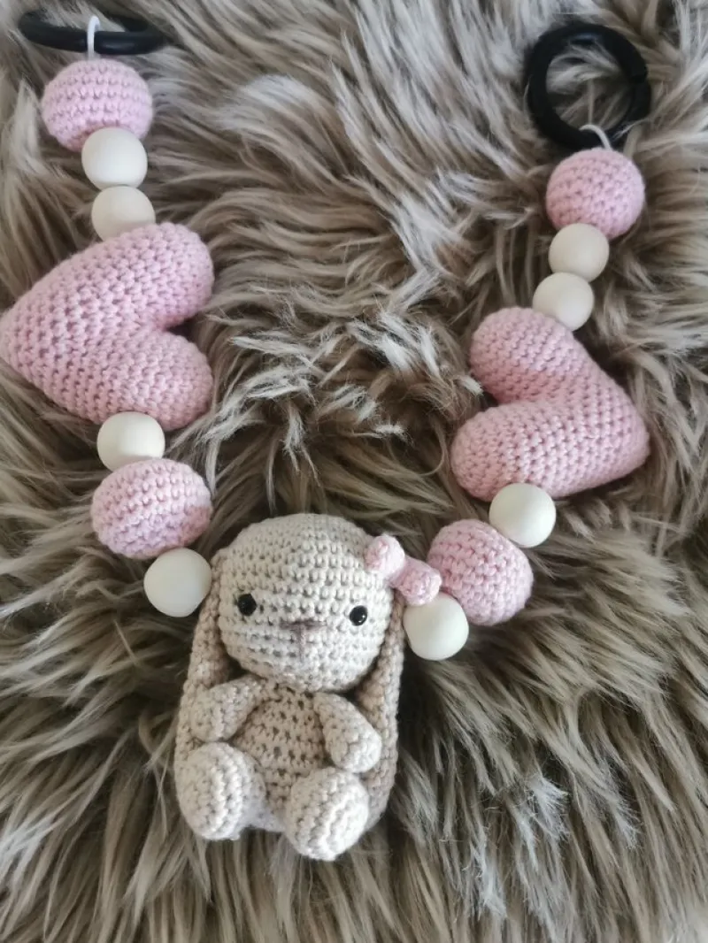 Virkad beige kanin med träkulor, rosa bollar och 2 hjärtan. Med godkänd barnsäker barnvagnsring.