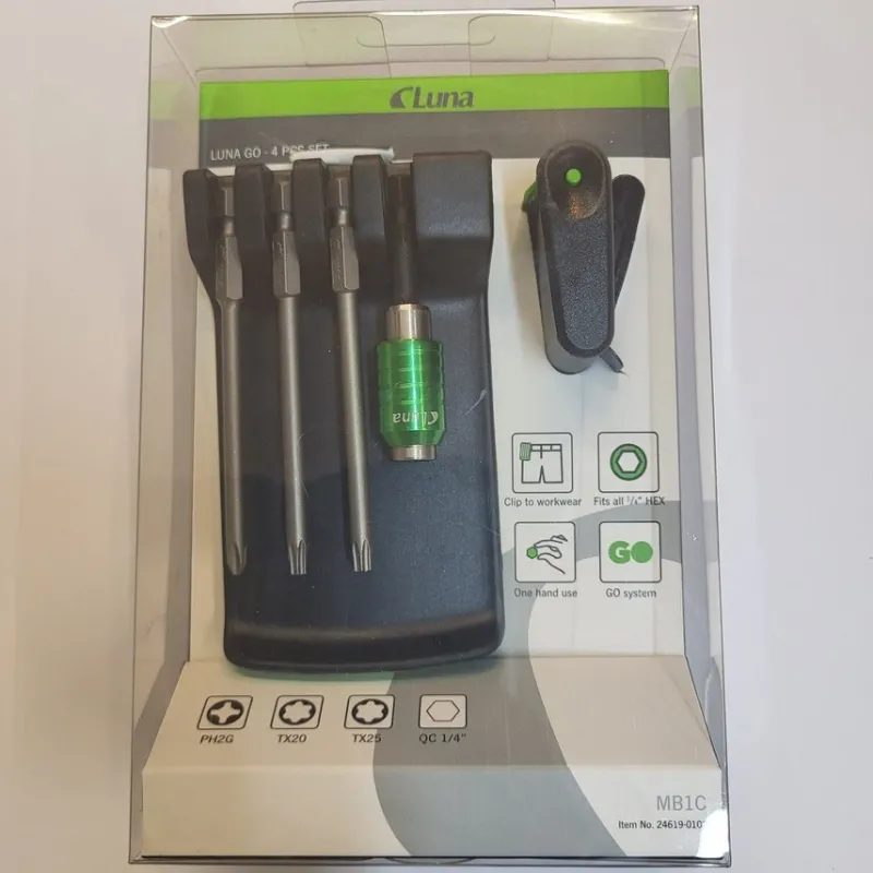 4 delars bitssats i Luna GO verktygshållare med bältesclips. Verktygshållaren har plats för ett toppmonterat och fyra hängande verktyg i ett unikt upphängningssystem med magnetlåsning. För en snabb smidig hantering och bra förvaring av verktyg med 1/4''-sexkantsfäste. Verktygshållaren är ledad och kan enkelt monteras och tas av från bältesclipset för bättre ergonomi och säkrare användning. Innehåller: PH2, TX20, TX25 samt snabbhållare 1/4"