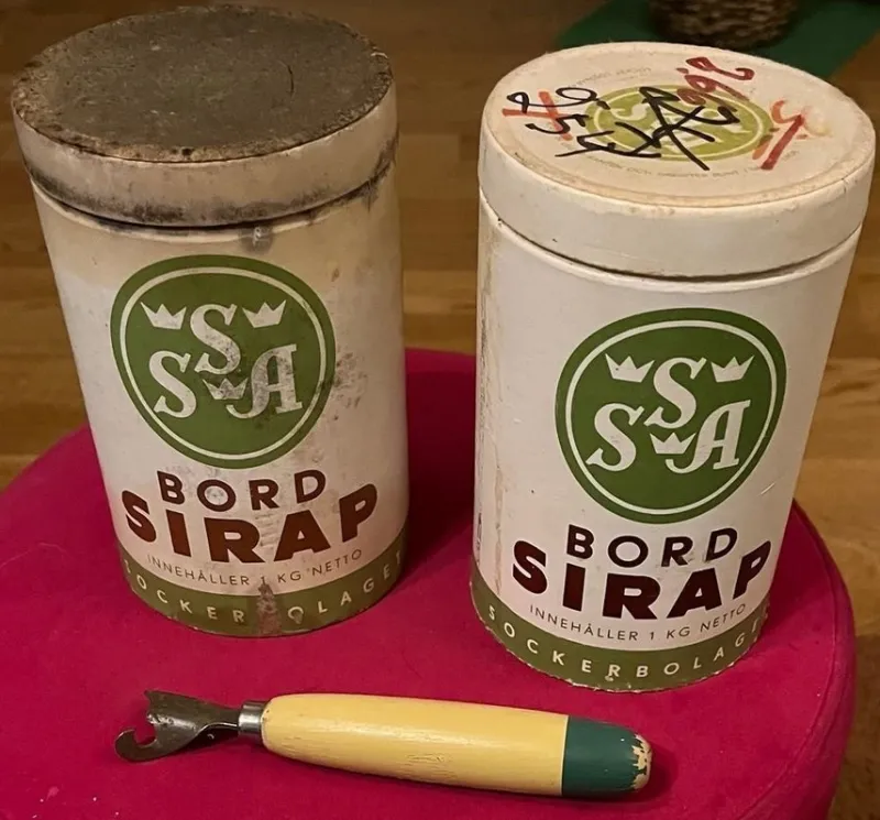 Tradera Bordsirap pappburkar höjd 14,5cm diam 9cm + konservöppnare> Bruks- & Prydnadsföremål