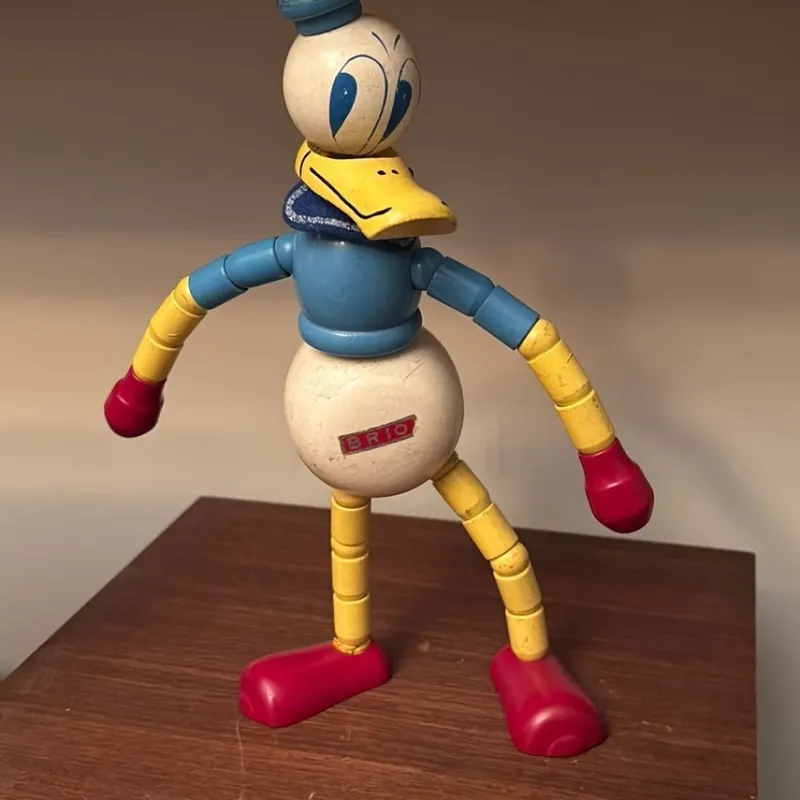 Söt och vintage BRIO, troligen Kalle Anka. En charmig leksak med rörliga leder.