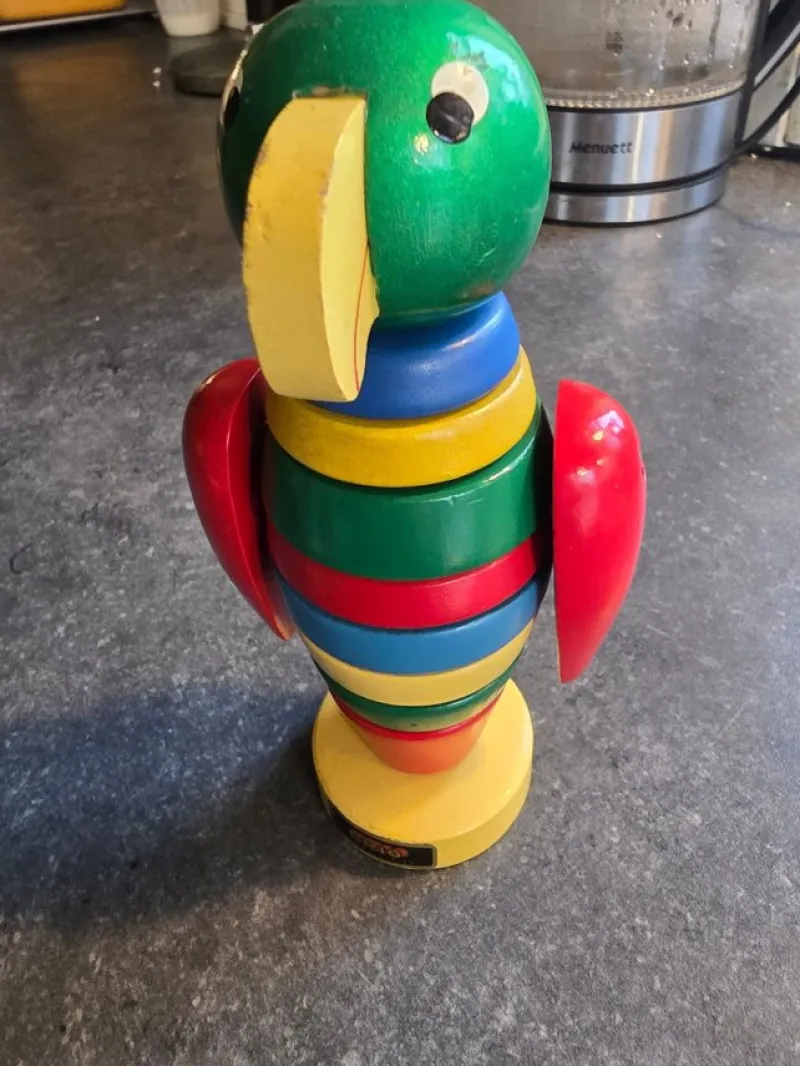 Söt och klassisk BRIO träleksak i form av en papegoja. Tillverkad mellan 1960-80 talet. Jättefint skick. Pedagogisk plockfigur