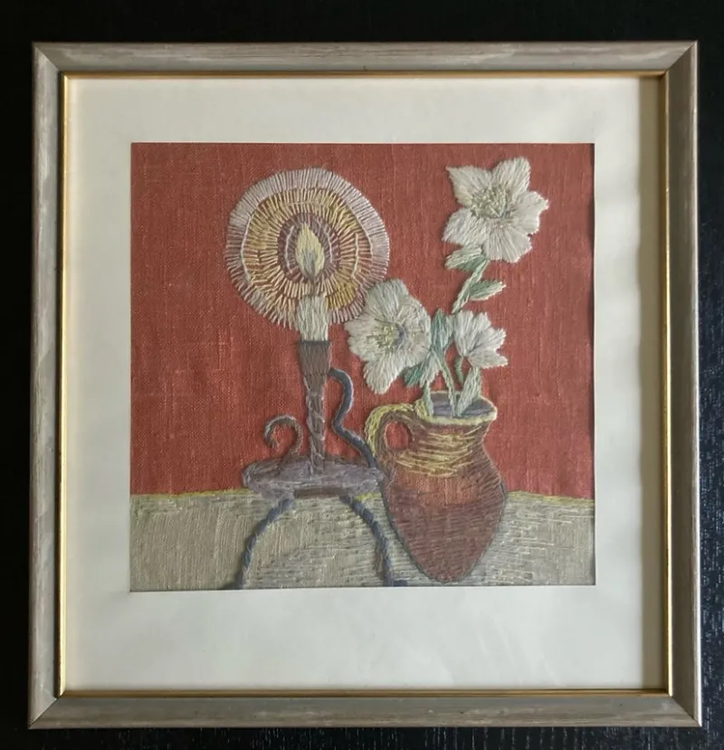 Vacker broderad tavla på linneväv, troligen från 1960-70 talet. Stilleben med ljusstake och blomvas. Passepartout något gulnad men helhetsintrycket är mycket bra.