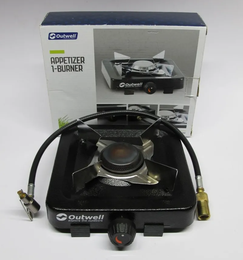 Portabelt 3000W 1-lågigt gasolkök / stormkök med reglerbar låga Outwell Appetizer 1-burner (modell 650605/200-BT). Slang, regulator och manual medföljer enligt bilder. Levereras i originalförpackning utan gasflaska (EN417 gaspatron passar till). Perfekt för camping eller för krisberedskap.