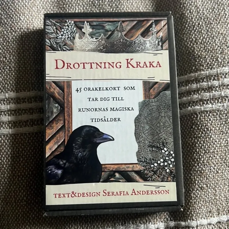 Drottning Kraka orakelkortslek. 45 kort som tar dig till runornas magiska tidsålder. Text & design Serafia Andersson.