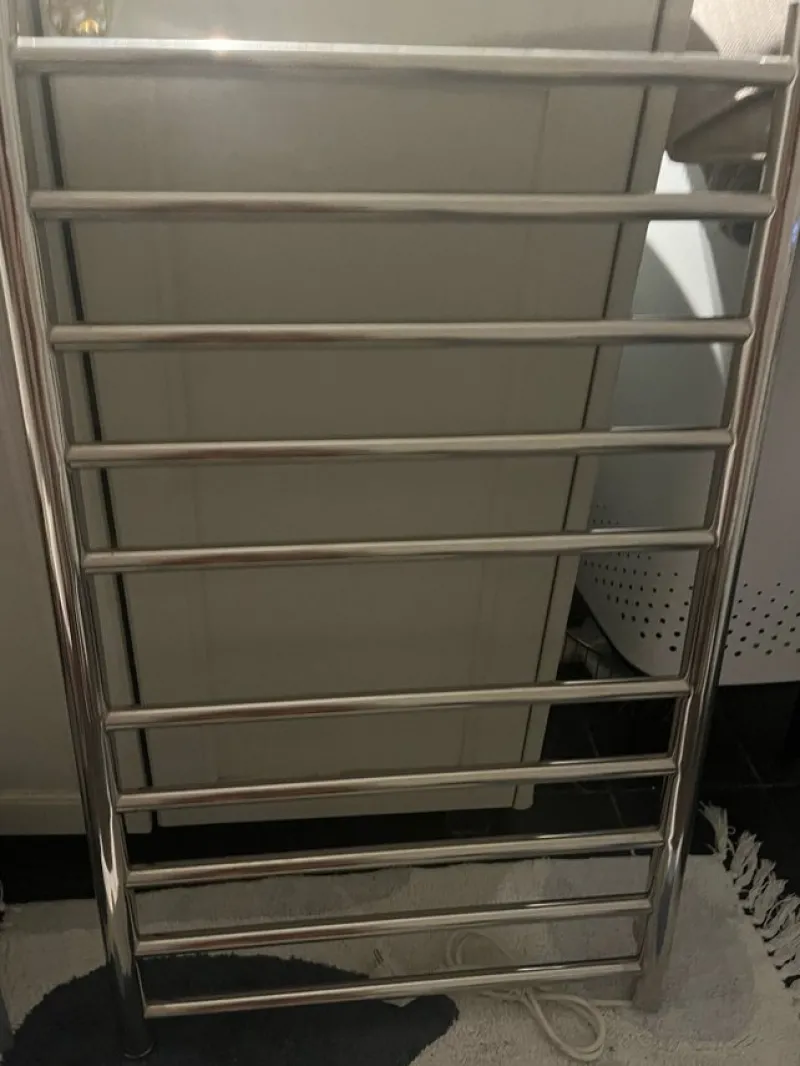 Snygg och praktisk elhanddukstork i rostfritt stål. Perfekt för badrummet för att hålla handdukar varma och torra. Enkel installation med stickkontakt.