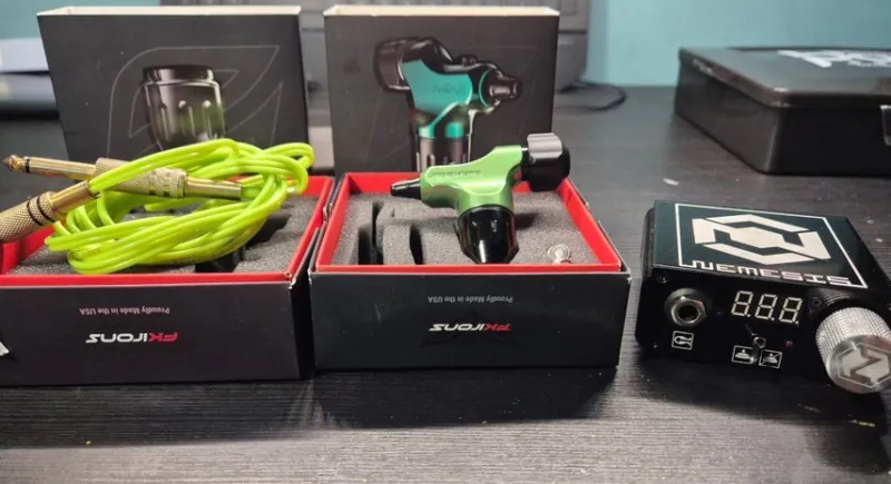 En riktigt schysst rotary maskin med 3 medföljande svänghjul för olika stroke som bytes lätt genom att lossa kroppen från motorn.
