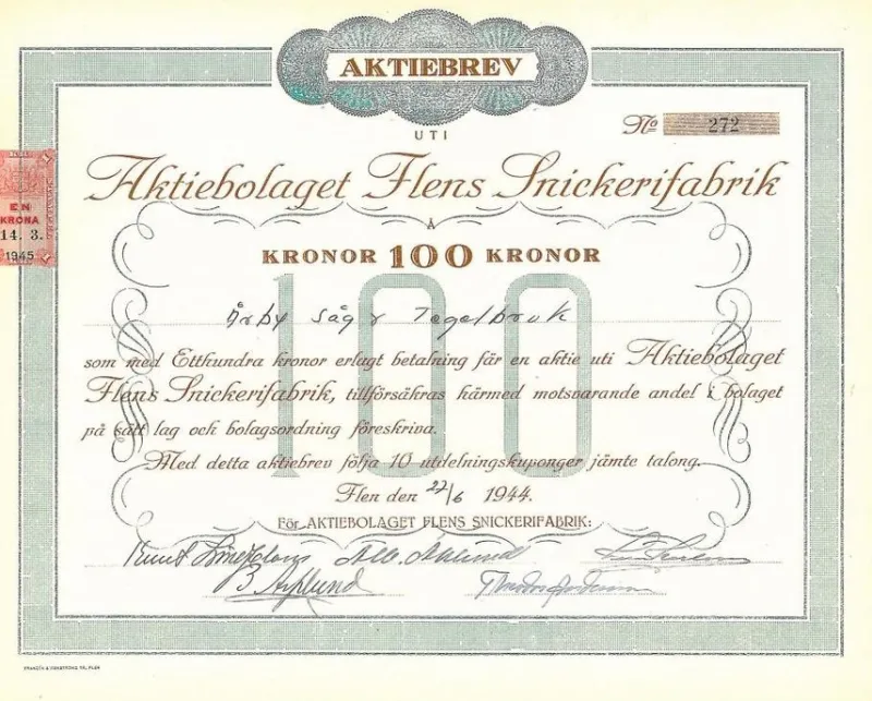 Flens Snickerifabrik, AB, 100 kronor, 1944, Flen, Utställd på Årby Sågs Tegelbruk.