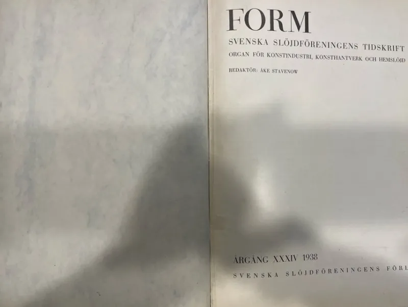 Inbunden årgång, 1938 av ”Form – Svenska slöjdföreningens tidskrift”. Innehåller artiklar och illustrationer om konstindustri, konsthantverk och hemslöjd. Inbunden i mörkblått skinnband med guldskrift på ryggen. Gedigen information om den tidens formgivning. Illustrerad. Komplett årgång!