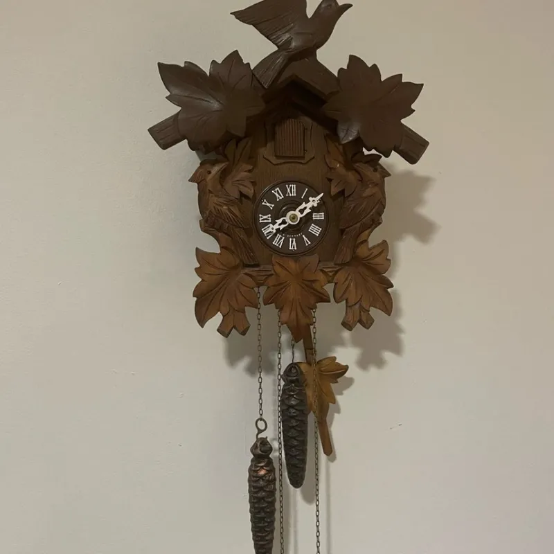 Gammal mekanisk Tysk gökur i trä komplett och nyservad går perfekt se bilder för egen bedömning levereras med lod, krön och pendel.