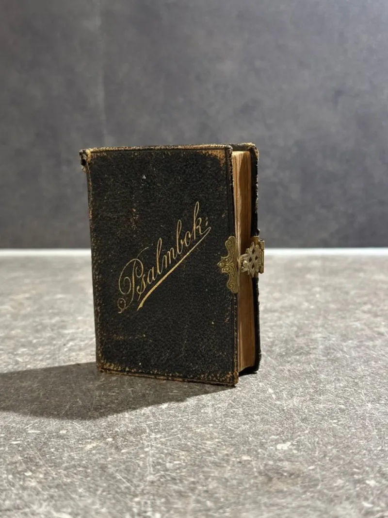 Liten, antik psalmbok från 1819 , utgiven av Gutar Weténs Förlag i Göteborg. Inbunden i nött svart skinn eller läder med guldfärgad text på framsidan. Visar tecken på ålder och användning.