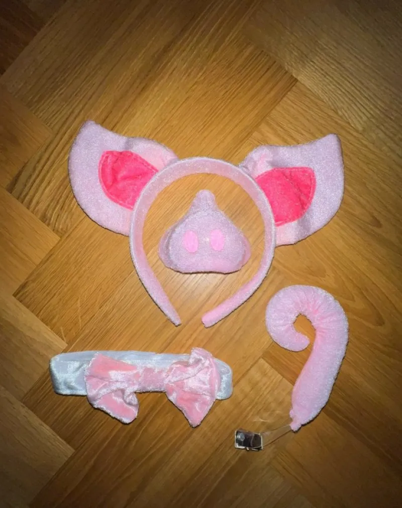 Söt griskostym med öron, tryne, fluga och knorr. Perfekt för maskerader eller roliga tillfällen.
