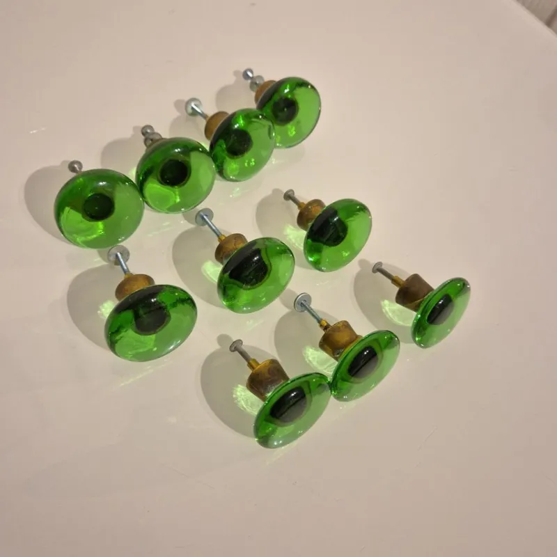 Snygga och tidlösa glasknoppar i grönt glas med mässingsdetaljer. 7 st är något tjockare än resterande 3. Se bilder.