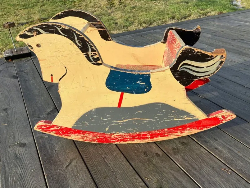 En gunghäst i trä från 40-50 talet, perfekt för lek eller nostalgi. Påminner om fabrikat Brio. Gunghästen har sin ursprungliga målning kvar med en härlig patina. Stadig och rejäl. Behåll den i sitt charmiga skick eller renovera med ny färg!