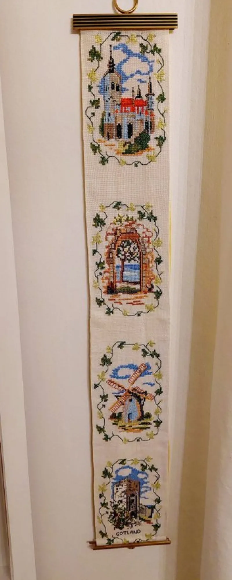 En handbroderad väggbonad med flera motiv från Gotland.