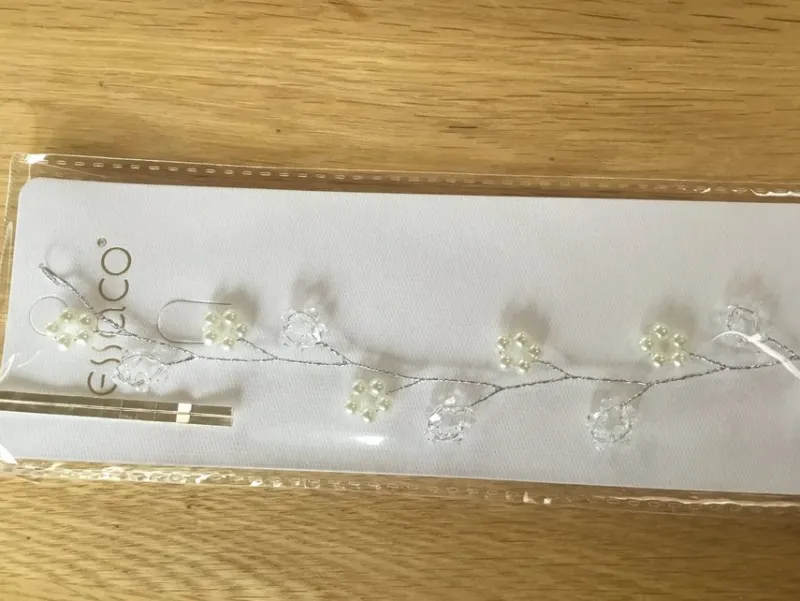 Hårsmycke – Skir silverfärgad metalltråd med klara pärlor och vita stenar