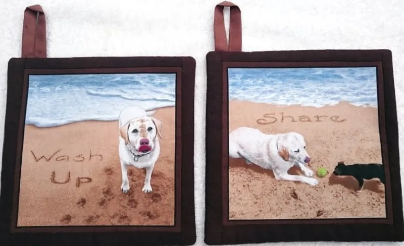 Två underbara grytlappar med lekande, glad, hundar på stranden som motiv. Designtyg med originellt motiv.
