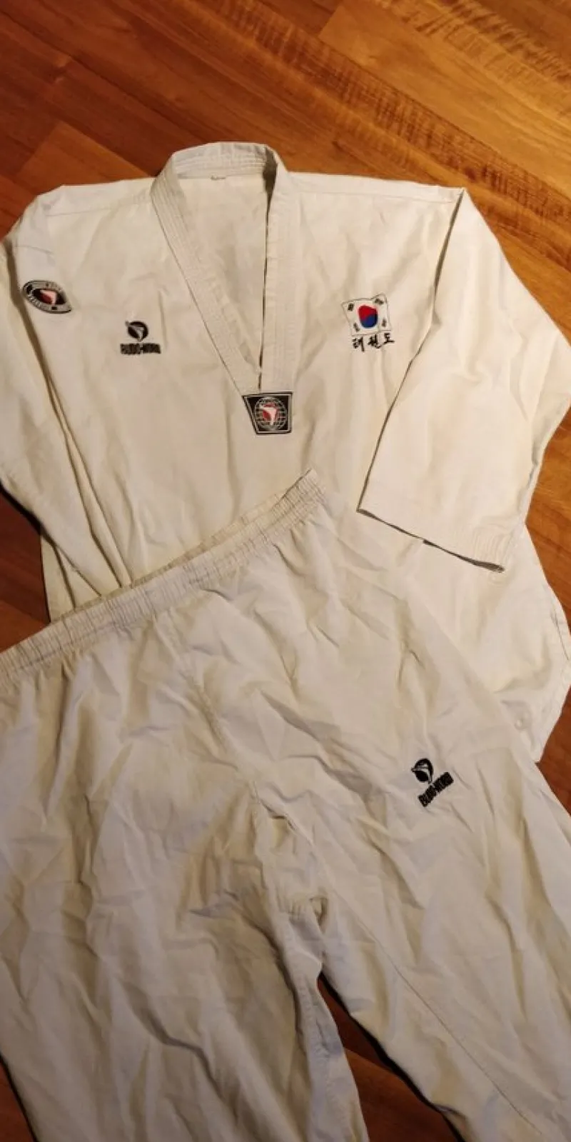 Taekwondo-dräkt från Budo Nord i storlek L/XL, 180 cm. (Passar dig på ca 178-185 cm). Dräkten inkluderar jacka, byxor och vitt bälte. Den har broderade detaljer och märken, inklusive den koreanska flaggan och Budo Nord-logotypen. Knyte i midja på byxorna. Materialet andas.