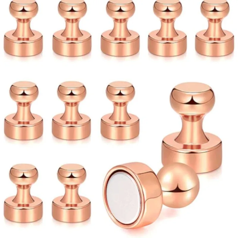 En liten kylskåpsmagnet med ett runt kartnålshuvud.