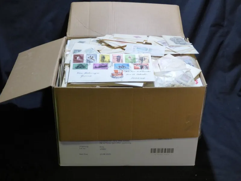 Kartong med blandat innehåll och kvalitet från flera olika länder och motiv. Där finns frimärken på blad. Diverse brev, kort, mm. Kuvert och pergamynkuvert med frimärken. Flera påkostade satser med postfriska** frimärken, troligen kompletta. Flera album med mer eller mindre insatta frimärken. Totalt ingår det tusentals med frimärken och annat i detta parti. Vikt totalt ca: 11 kg. Dessa partier är svåra att värdera både för säljare och för köpare, så därför börjar vi så lågt som möjligt på 1:- i utrop och fri frakt med spårbart. Se bilder i från partiet. FYND UTROP!