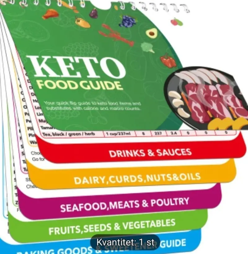 En omfattande och användarvänlig guide till keto-vänliga livsmedel, organiserad i fem enkla kategorier. Innehåller över 168 livsmedel med kalorier, protein, fett och netto kolhydrater. Perfekt för både nybörjare och erfarna keto-entusiaster. Vattenavvisande material.