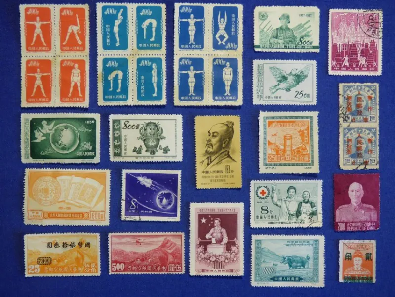 Kina / China. Samling med oräknade frimärken. Se 8 stycken olika bilder. Alla frimärken ligger löst i 8 stycken pergamynkuvert på blad, sista bilden. Se bilder på samtliga frimärken. FYND UTROP!