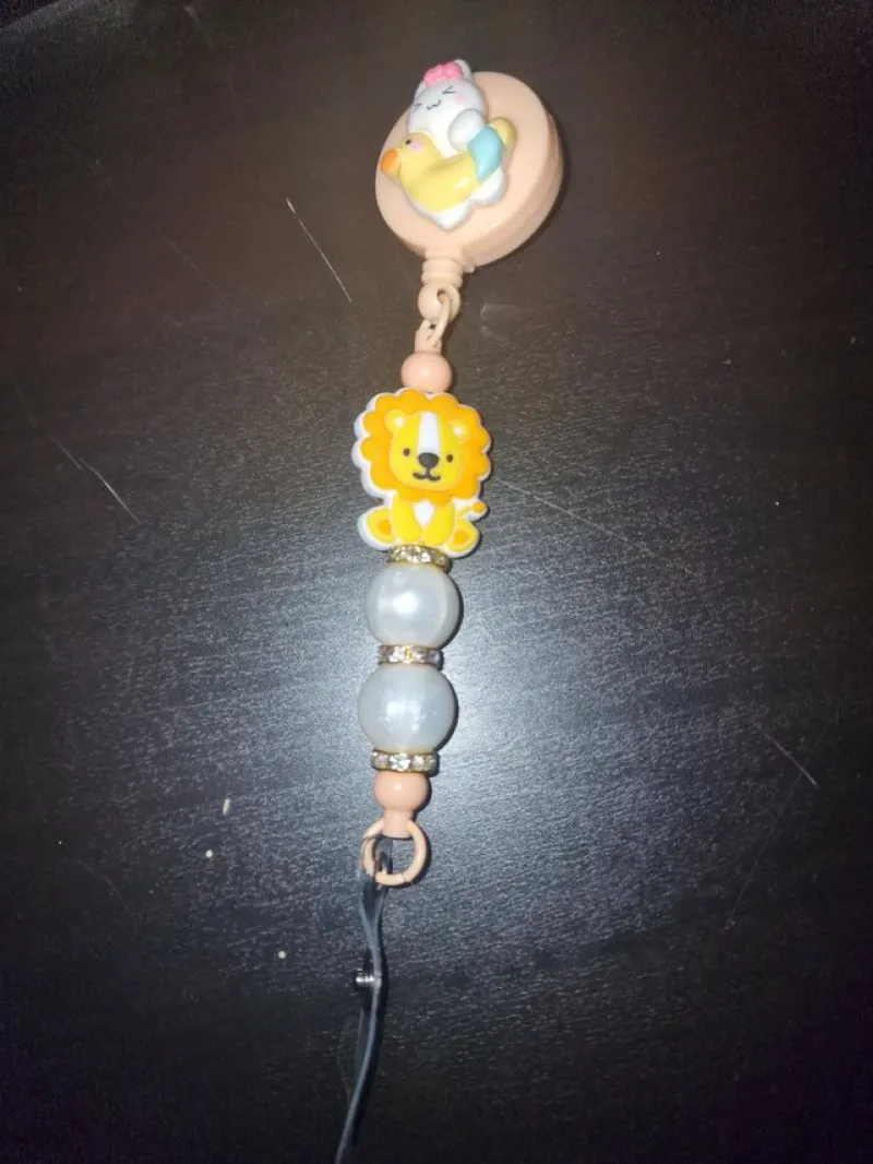 Söt korthållare med ett gulligt lejonmotiv och skimrande pärlor. Perfekt för att fästa nycklar, ID-kort eller andra småsaker. En rolig och praktisk accessoar!