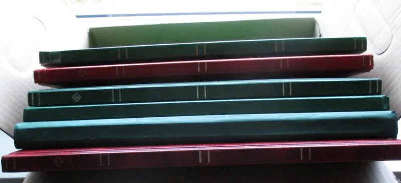 Tradera Låda med sex insticksalbum med frimärken från många länder^ Flera Länder