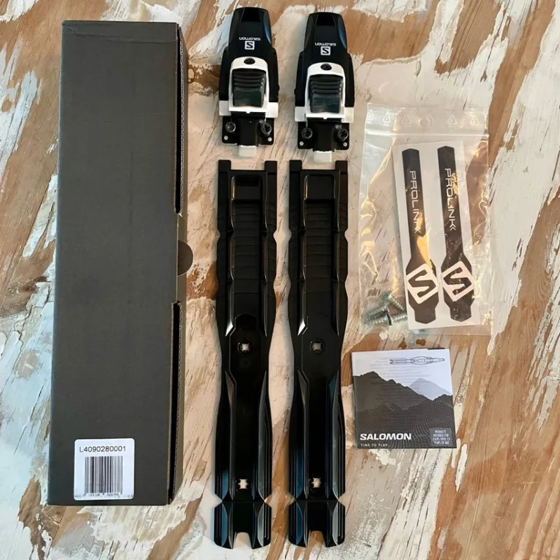 Salomon Prolink Pro Classic bindningar, nya och oanvända i originalförpackning. Modellnummer L409028001. Inkluderar alla delar som syns på bilderna: originalkartong, bindningar, skruvar och klistermärken.