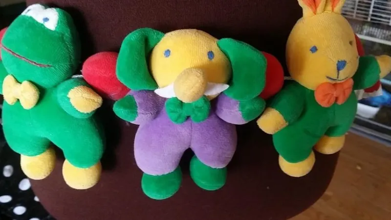 djur i plysch med röda plyschkulor på vit kraftig rundresår med öglor