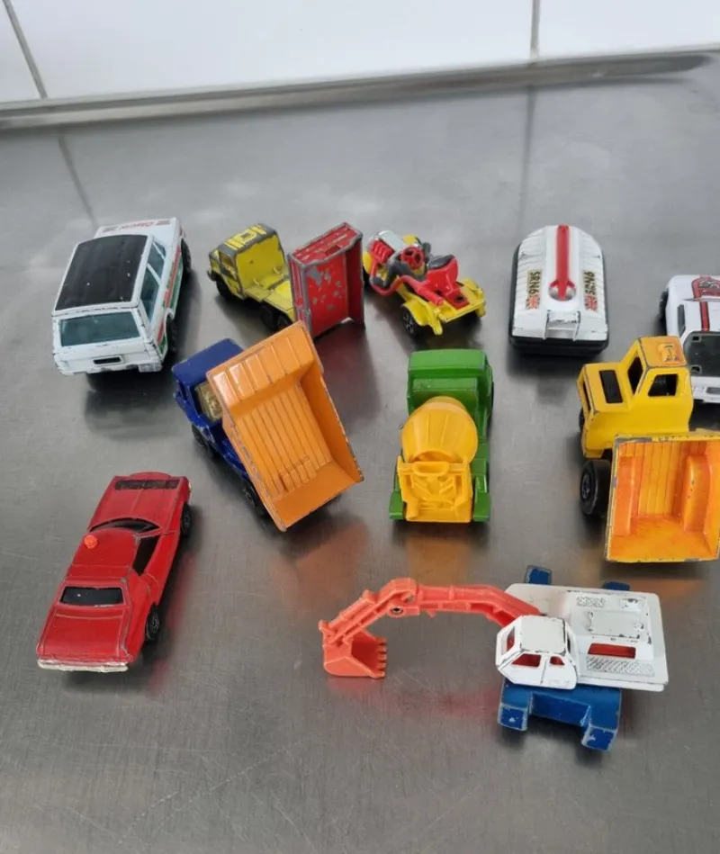 Olika modeller av äldre leksaksbilar i lekt skick. Finns skavanker.
