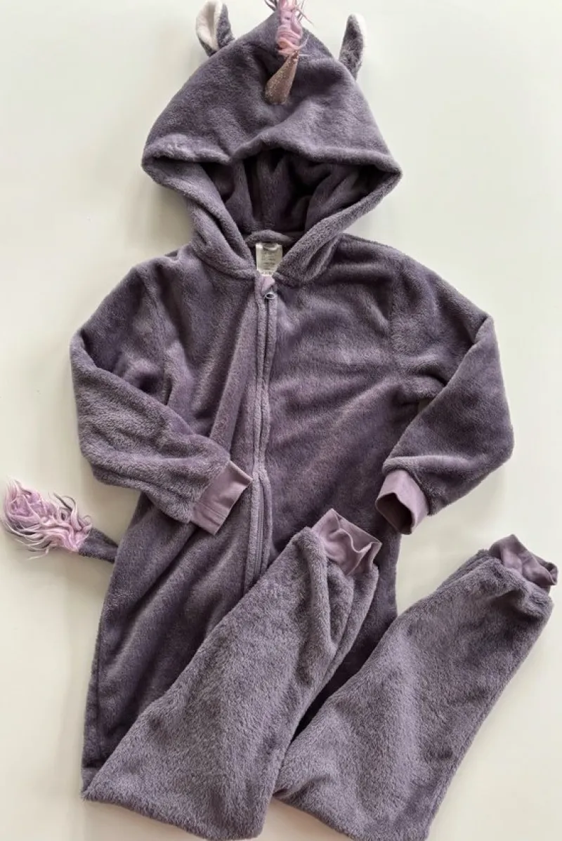 Den har huva med glittrigt enhörningshorn och rosa man. Mudd vid ärm- och benslut. Avtagbar svans som fästs med kardborre. Dragkedja fram.