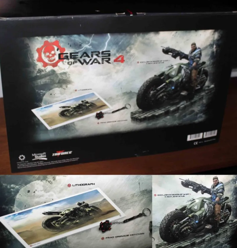 Megastor samlarbox, 53,5 x 35 x 26 cm med stor detaljrik figur – JD Fenix på motorcykel (som lyses upp med två AA-batterier – medföljer ej), litografi och nyckelring. Några skador på ytterkartongerna (se detaljbilder). Ett spelkort med tre XBOX LIVE spelkoder medföljer (eventuellt aktiveringsdatum kan ha passerat), men inga discar.