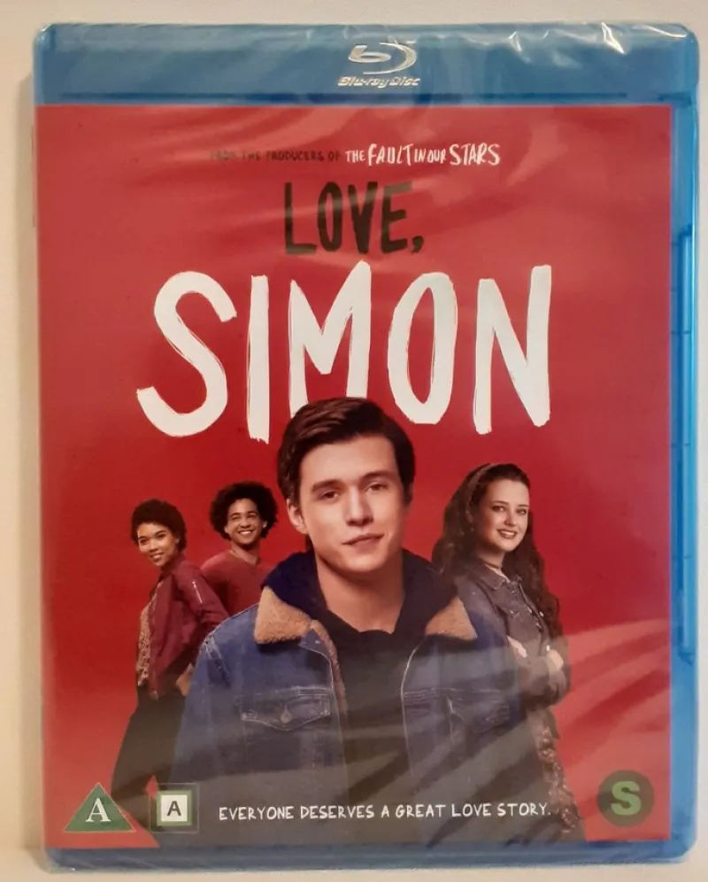 Blu-ray skiva av filmen Love, Simon. Filmen är en romantisk komedi om en tonåring som kämpar med att komma ut som homosexuell. Filmen är baserad på Becky Albertallis roman Simon vs. the Homo Sapiens Agenda.