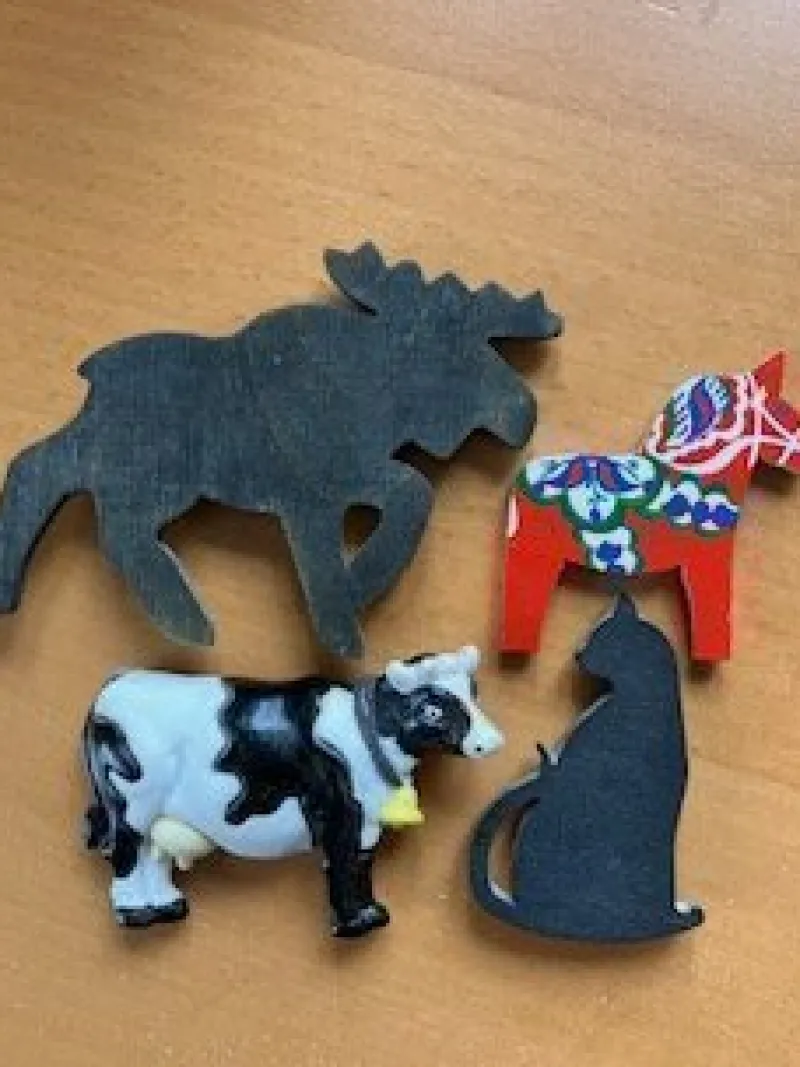 Säljer ett set med fyra svenska djurmagneter. Djuren är en älg, en ko, en katt och en dalahäst. Magneterna är i trä utom kon som är i något gipsliknande material och är perfekta för att dekorera kylskåpet eller andra metallytor.