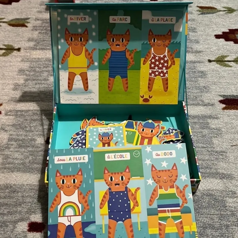 Spelet innehåller 2 magnetiska tavlor, 6 kattfigurer och exakt 46 magnetiska kläder. Perfekt för att lära sig om kläder, årstider och olika tillfällen. Spelet är i bra skick och komplett.