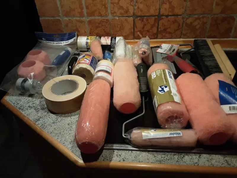 Målarset med olika roller, penslar, maskeringstejp och andra tillbehör. Perfekt för målnings- och renoveringsprojekt.