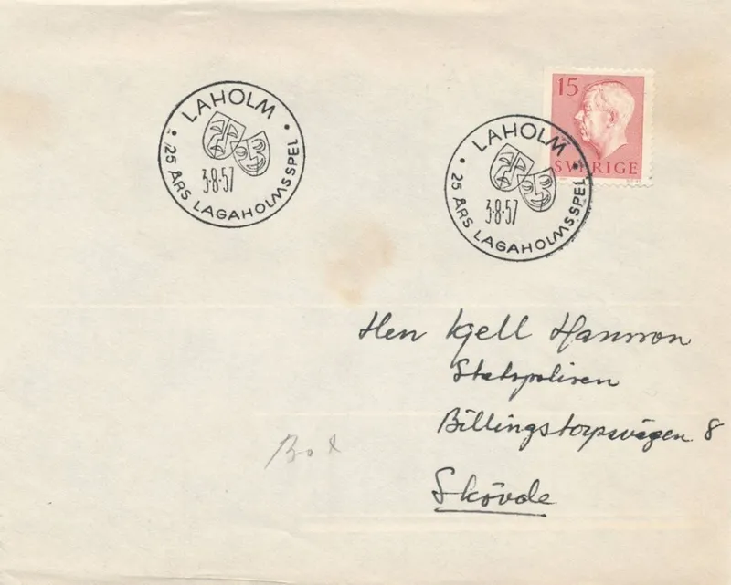Försändelse med minnespoststämpel Laholm 25 Års Lagaholmsspel 1957