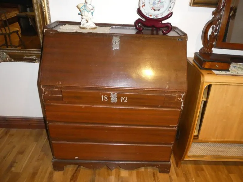 Detta är en sekretär från 1812, den är 105 cm hög, 86 cm lång och 44 cm bred. Den har 10 st små lådor, 2 mellan lådor och 3 st stora lådor. Bruksskick, lite nött och sliten men det är förväntat med tanke på åldern. OBS-Endast avhämtning.